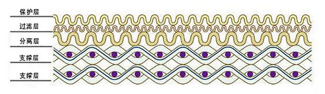 金屬濾芯所采用的復合網一般分為五層結構,分別為保護層、過濾層、分離層、支撐層四部分組成,燒結網材料易于成型、加工和焊接,制作方便。既有均勻穩定的過濾精度又有較高的強度與剛度,對抗壓強度 要求高及過濾粒度要求均一的場合是一種理想的過濾材料。過濾原理為表層過濾,網孔孔道光滑,具有優異的反洗再生性能,可以反復長期使用,非常適合連續化與自動化操作。