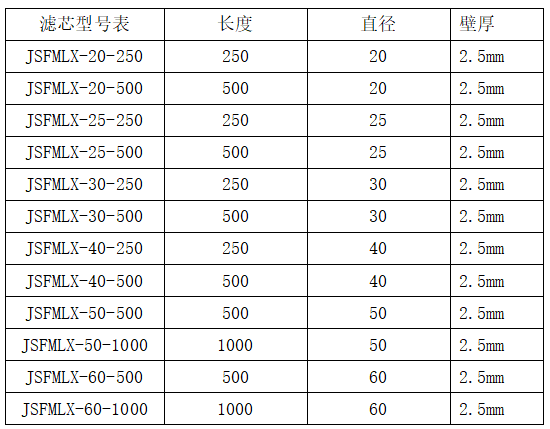 金屬粉末濾芯型號匯總表